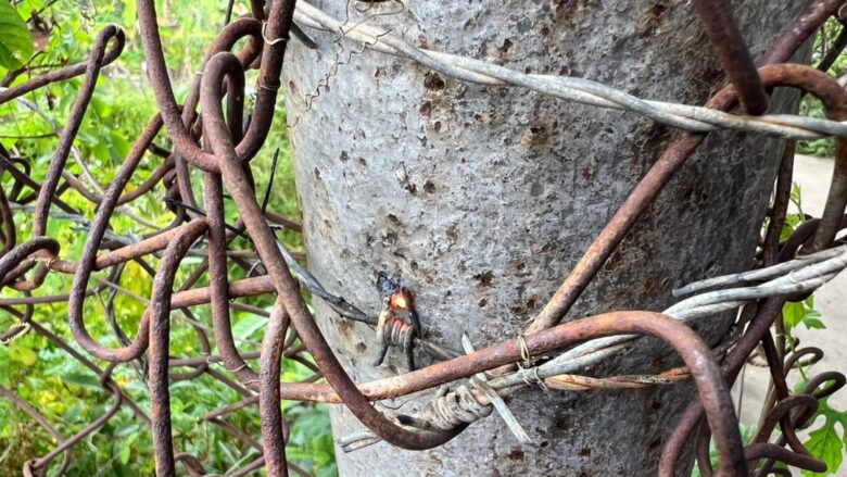 La estructura, situada a escasos 50 metros de los semáforos del sector El Picacho, presenta cables deteriorados que hacen contacto directo con el metal, lo que genera cortocircuitos visibles.