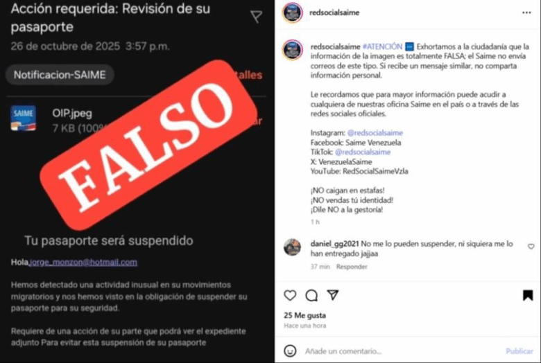 «#ATENCIÓN ➡️ Exhortamos a la ciudadanía que la información de la imagen es totalmente FALSA; el Saime no envía correos de este tipo. Si recibe un mensaje similar, no comparta información personal. Le recordamos que para mayor información puede acudir a cualquiera de nuestras oficinas Saime en el país o a través de las redes sociales oficiales», se lee en la publicación.