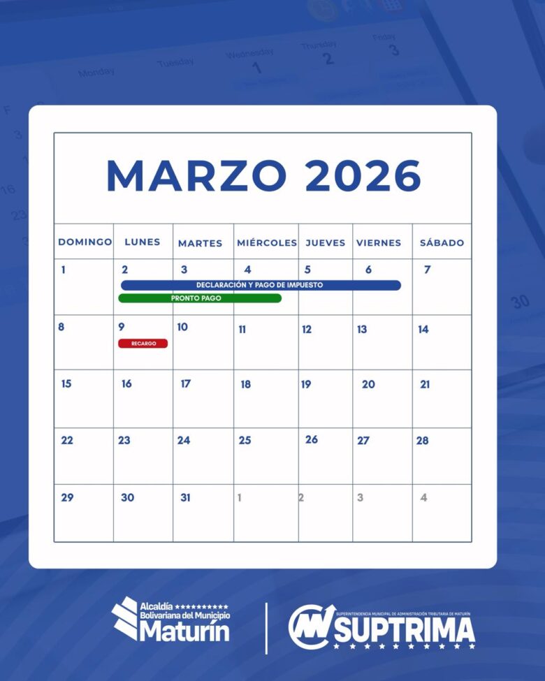 La Superintendencia Municipal de Administración Tributaria de Maturín (Suptrima) presentó el calendario tributario correspondiente al mes de marzo del presente año, con el fin de que los contribuyentes se mantengan al día con sus contribuciones, eviten sanciones y contribuyan con el crecimiento del municipio; así lo informó Ysis Pérez, superintendenta tributaria.