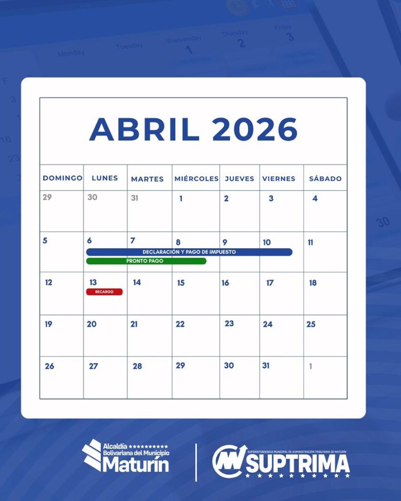 Desde la Superintendencia Municipal de Administración Tributaria de Maturín (Suptrima) fue presentado el calendario tributario correspondiente al mes de abril de 2026, con el fin de que los contribuyentes se mantengan al día evitando sanciones y que sus aportes acompañen el crecimiento del municipio; así lo informó Ysis Pérez, superintendenta tributaria.