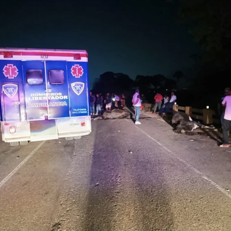 Un fuerte accidente de tránsito movilizó a las unidades de emergencia en el municipio Libertador durante la madrugada de este viernes 27 de marzo. El siniestro ocurrió luego de que un vehículo de transporte privado impactara contra un grupo de animales bovinos que se encontraban en la vía pública.