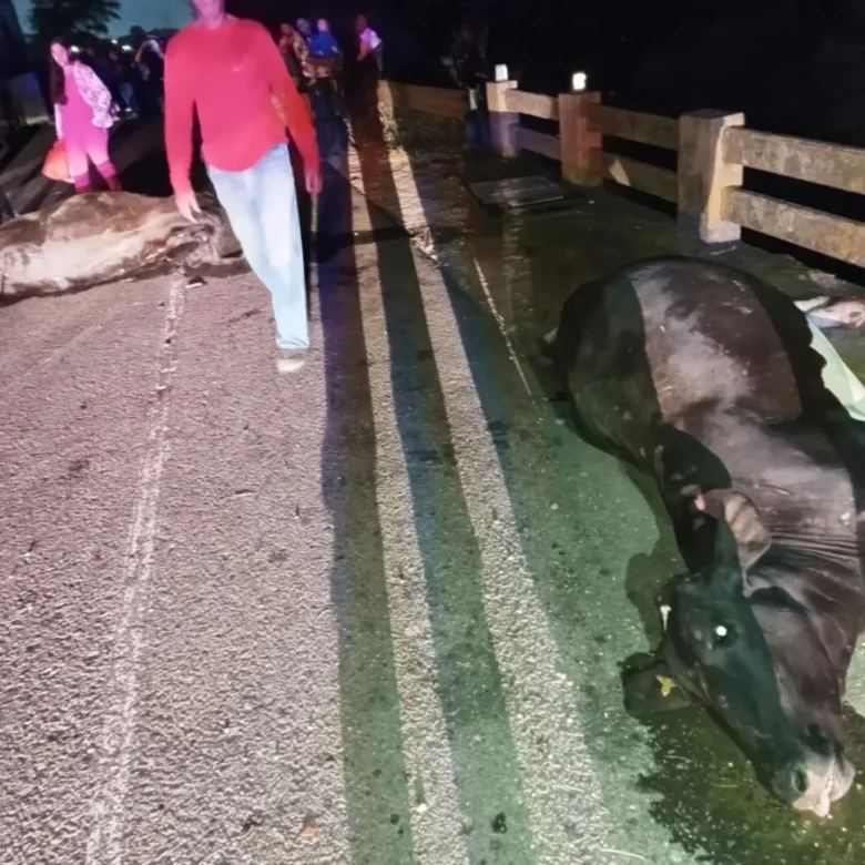 Según la minuta oficial, una unidad de transporte tipo «Express» no pudo evitar el choque contra cuatro vacas que permanecían sobre la calzada. El impacto dejó como saldo a un ciudadano lesionado, quien viajaba a bordo de la unidad involucrada.