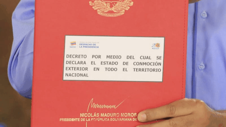 De acuerdo con la Constitución de la República Bolivariana de Venezuela el estado de conmoción interior o exterior se puede decretar «en caso de conflicto interno o externo que ponga seriamente en peligro la seguridad de la nación, de sus ciudadanos y ciudadanas o de sus instituciones» y establece que el mismo «se prolongará hasta por noventa días, siendo prorrogable hasta por noventa días más».