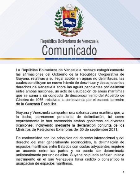 «Guyana no puede señalar un solo instrumento en el que Venezuela haya cedido o consentido la usurpación de espacios marítimos», concluye el comunicado de la Cancillería.